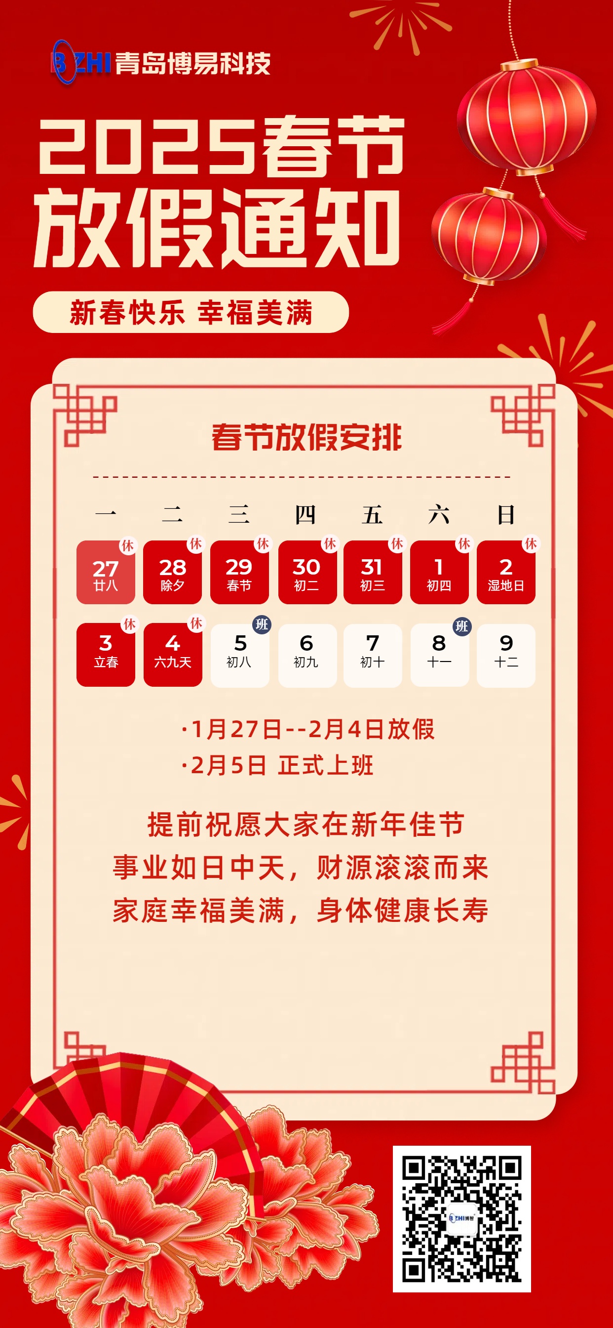 放假时间:2025年1月27日-2月4日