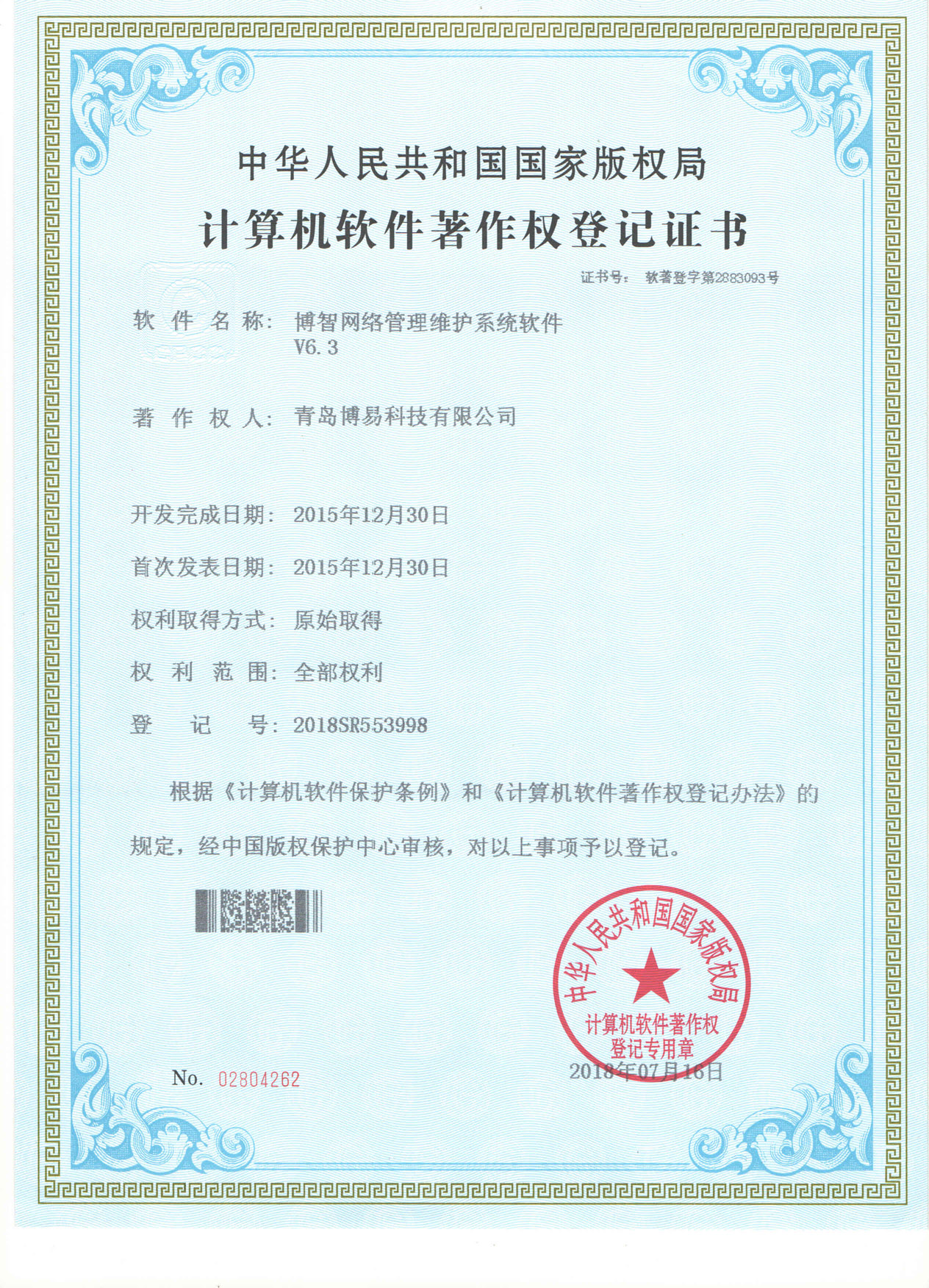 计算机软件著作权登记证书——博智网络管理维护系统软件V6.3