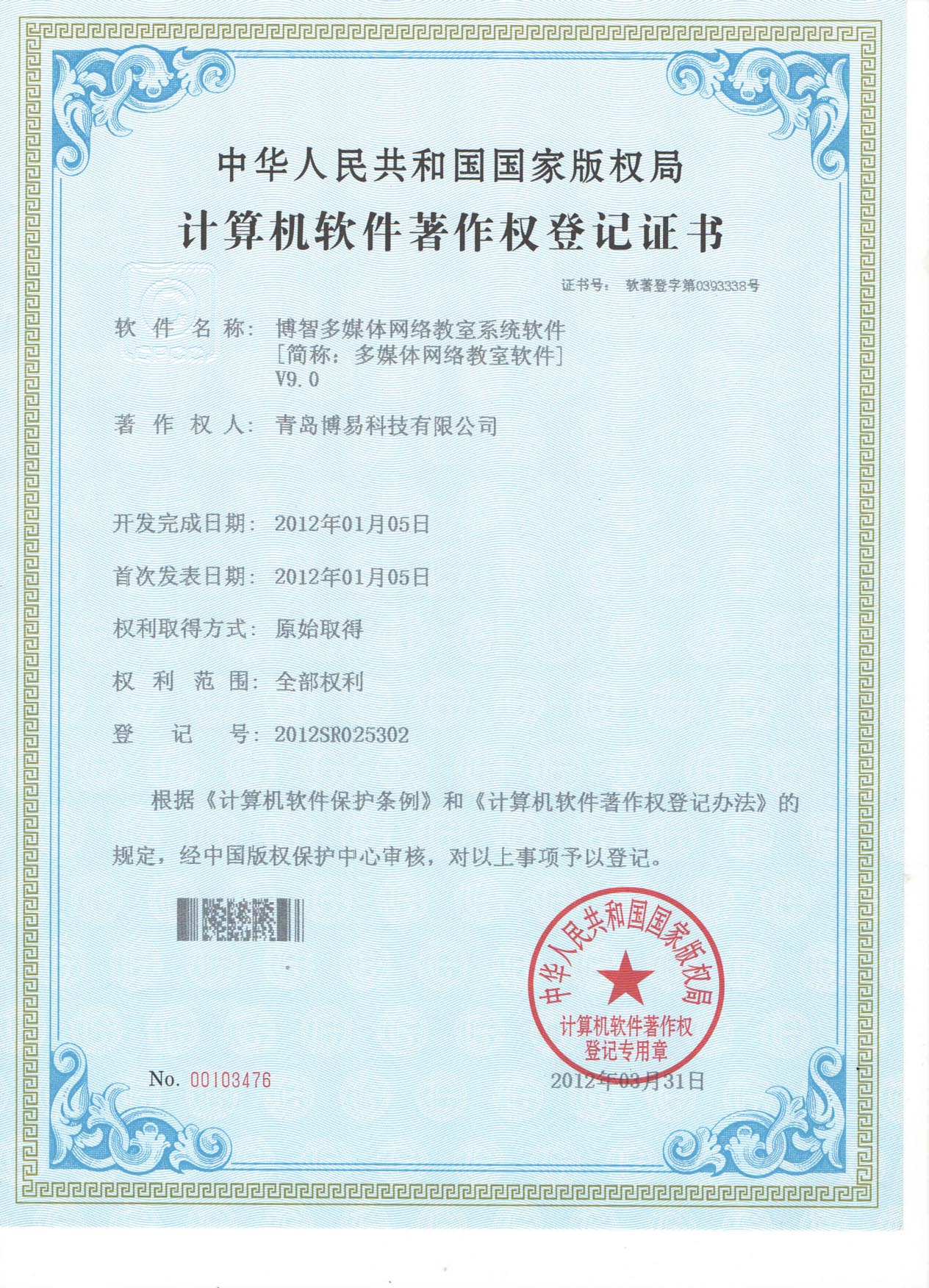 计算机软件著作权登记证书——博智多媒体网络教室系统软件V9.0