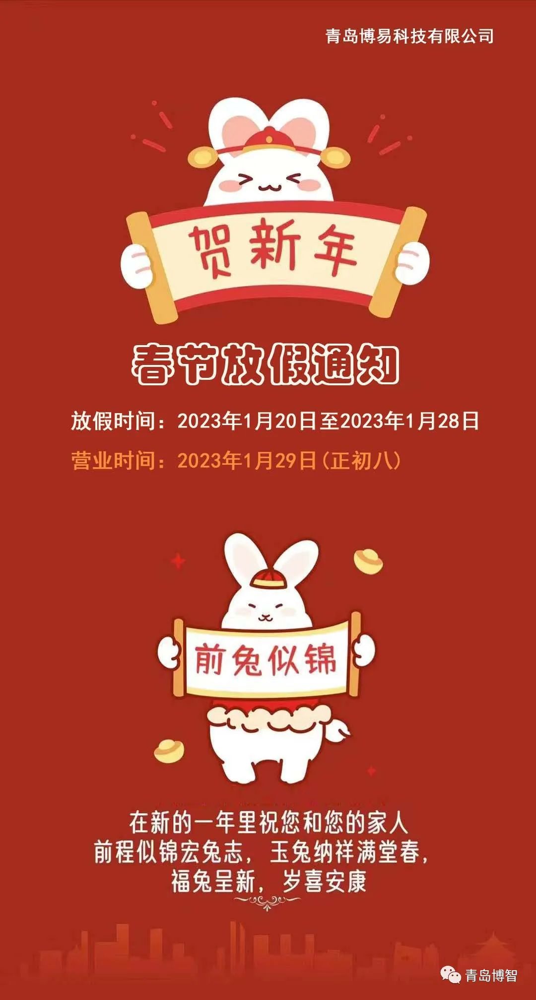 2023年春节来临之际,青岛博易科技全体员工恭祝新老朋友新年新气象,鸿运当头,身体健康,阖家欢乐!