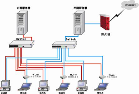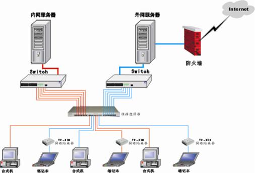 单布线方案适用于内外网服务器共用一套线路的单线网络,终端使用BOZHI-V6.1型外置笔记本隔离卡,线路上须配合使用博智BOZHI-V66-NET8或BOZHI-V66-NET24网络线路选择器。