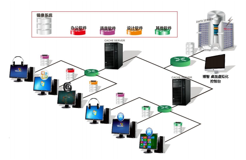 博智桌面虚拟化采用独有的PC桌面环境集中存储、派送、管理、控制、维护技术,通过网络派遣多种桌面(OS&AP)环境到桌面端。实现了按需交付和随需选择桌面(OS&AP)环境的全虚拟化IT基础架构。